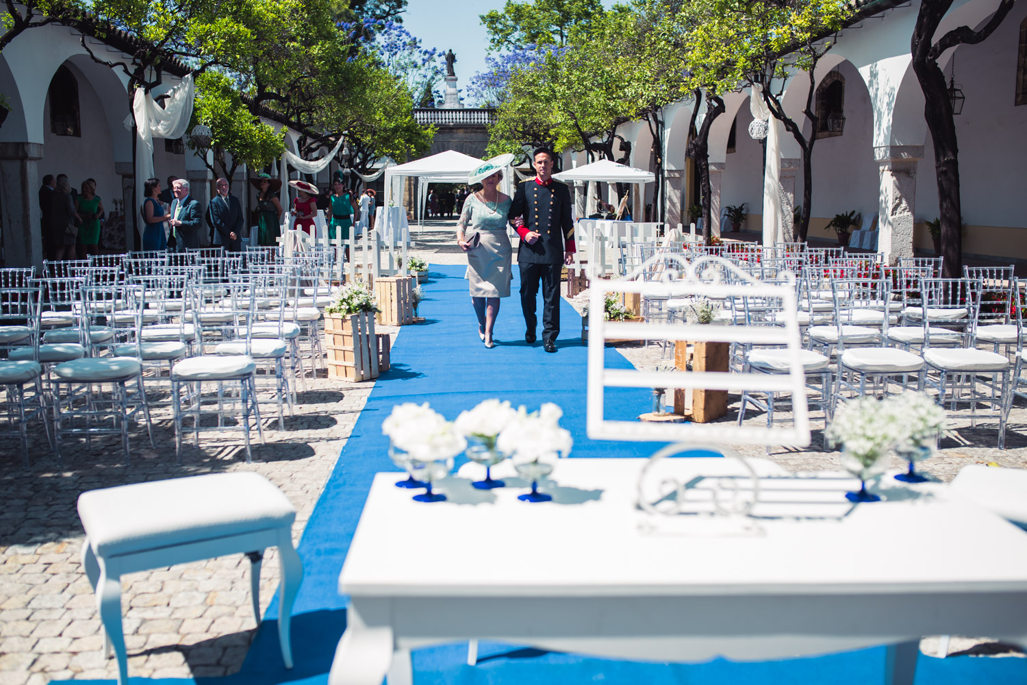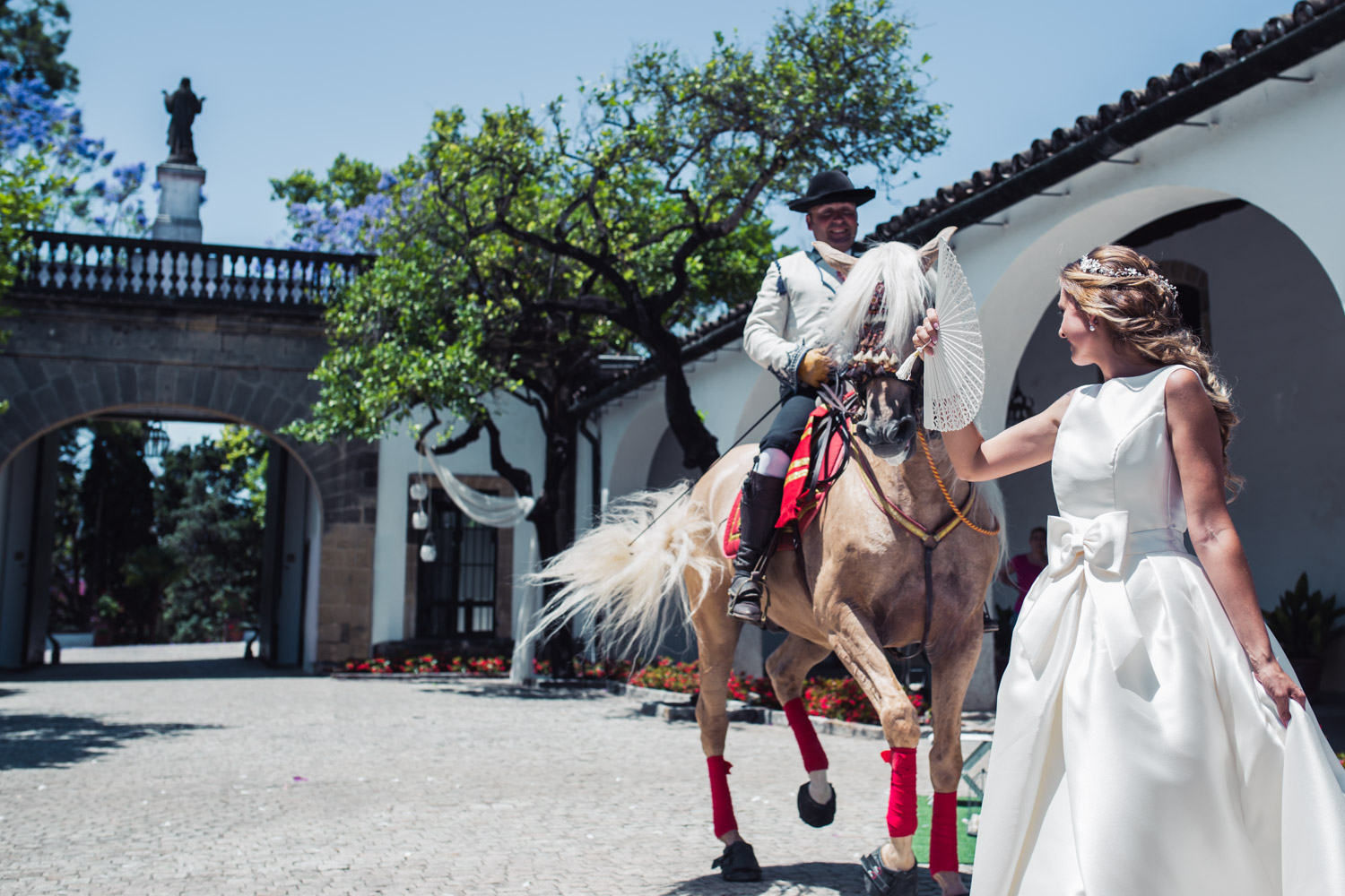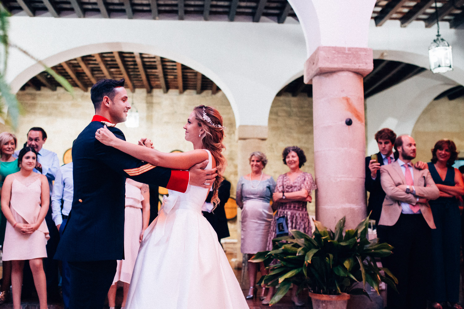 La bodega más antigua de Jerez de la Frontera. Un lugar precioso, con un gran jardín, patios antiguos y salones repartidos por toda la bodega. La ceremonia se celebró en el patio principal de la bodega, dando lugar más tarde a los aperitivos y al espectáculo ecuestre.